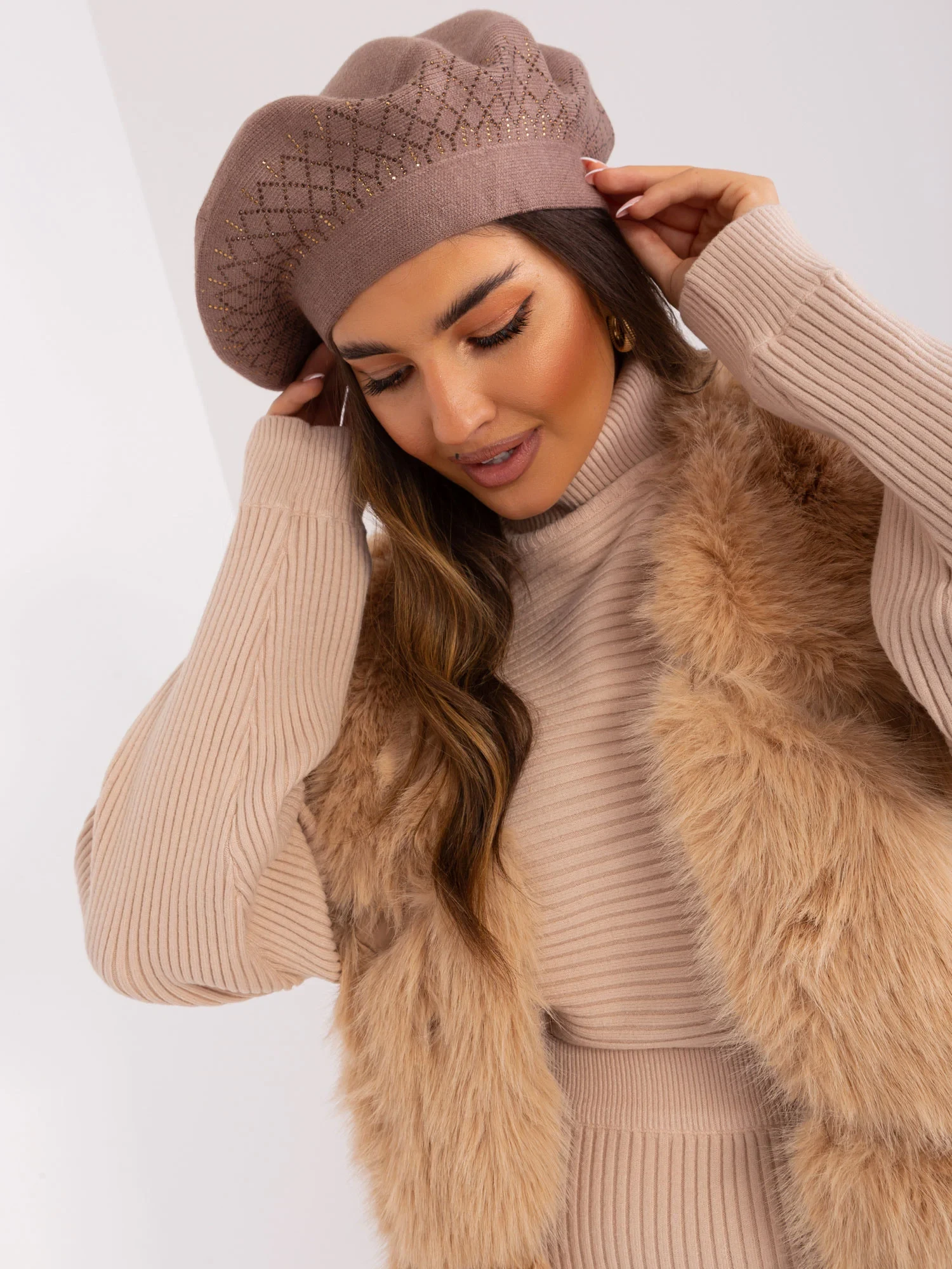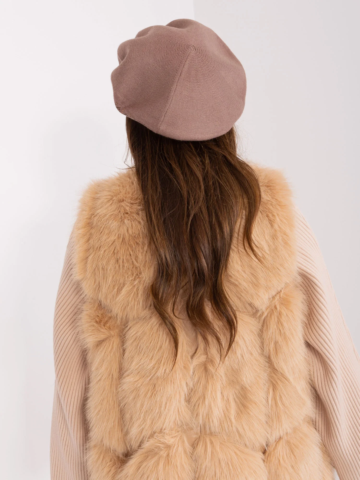 Hnědý pletený baret.