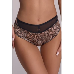 Brazyliany AV 2191/B Tiger marki AVA to propozycja dla kobiet, które cenią drapieżny styl i elegancję. Wykonane z elastycznej dzianiny w tygrysi print, doskonale podkreślają kobiece kształty, dodając sylwetce seksapilu. Cielisty tiul w połączeniu z czarną lamówką tworzy efektowny kontrast, który przyciąga spojrzenia i nadaje bieliźnie lekkości. Dzięki wysokiej zawartości poliamidu są trwałe i odporne na uszkodzenia, a dodatek bawełny i elastanu gwarantuje komfort noszenia przez cały dzień.