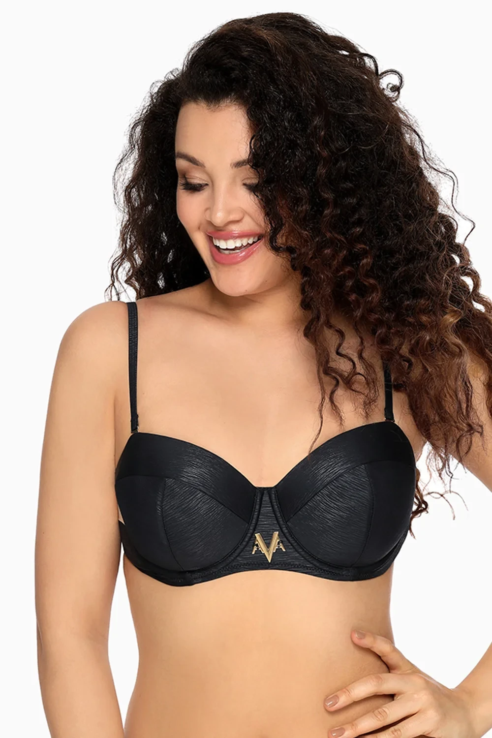 Plavky značky Ava, model SK-148. Mají drátky, které podpírají prsa a správně je tvarují. Výrobek má nastavitelná ramínka s možností jejich odepnutí. Háčky na ramínka. Plavky se zapínají na přezku. Místo zapínání: na zádech. Výrobek je vyroben z 80 % polyamidu, 20 % elastanu. Výrobek má kapsy na vložky. Dámský výrobek.