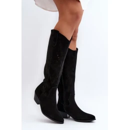 Boty s prolamovaným svrškem před kolenem. Vyrobeno z přírodní kůže. Na nízkém podpatku. Nazouvací model s dodatečným zapínáním na zip. Špičatá špička. Mírně profilovaná stélka z přírodní kůže zajistí pohodlí při používání. Ideální k mnoha outfitům! Rozhodně byste je měli mít ve svém šatníku!