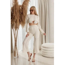 Dámský ažurový komplet v barvě ecru - crop top a dlouhé kalhoty (1978)