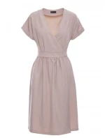 HLAVNÍ LÁTKA 63% polyester 33% wiskoza 4% elastan PODŠÍVKA 95% polyester 5% elastan LÁTKA: hladká tkaná látka s jemným povrchem PODROBNOSTI O PRODUKTU Výstřih: zavinovací výstřih do V Límec: šálový límec Rukávy: 7/8 délky s ohrnutými manžetami Pas: zvýrazněný páskem Zapínání: zavazování v pase Kapsy: žádné Podšívka: částečně podšitá Model: S415 Navrženo a vyrobeno v Polsku Modelka je vysoká 174 cm a nosí velikost S STYL A STŘIH Styl: zavinovací šaty Tvar: vypasovaný vršek, rovná sukně s mírným uvolněním Délka: pod kolena