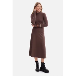 B299 Žebrované midi šaty s asymetrickým pasem - hnědé