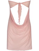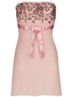 Nebesky lehký a smyslný top babydoll, který se dodává s velmi jemnými tangy. Jemný, průhledný, pudrově růžový tyl zakryje vaše tělo a top bohatě zdobený zlatou, třpytivou výšivkou a holá záda znamenají mimořádně stimulující hru pocitů. Top je nastavitelný díky zavazování na zádech.