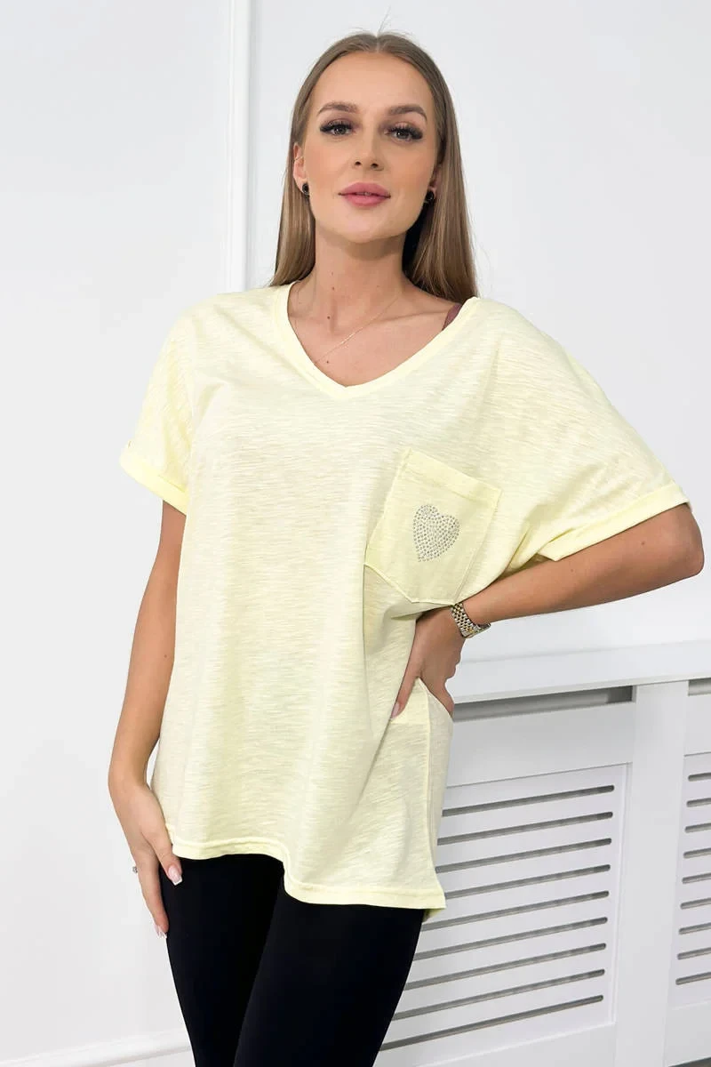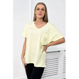 Bavlněná halenka s výstřihem do V a kapsičkou je ideální pro letní dny. Vyrobeno z bavlny pro větší pohodlí. Výstřih do V dodává halence ženský vzhled, zatímco náprsní kapsa jí dodává ležérní nádech. Taková halenka je ideální pro každodenní i formálnější outfity a je mimořádně univerzálním kouskem šatníku. Velikost je univerzální a vyhovuje dámám, které nosí velikost S, M nebo L.