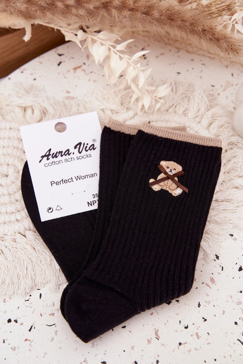 Dámské bavlněné pruhované ponožky zdobené roztomilým medvídkem s mašlí jsou sladkým a stylovým doplňkem na každý den. Skvěle padnou na nohu, zajišťují pohodlí po celý den. Ideální pro přidání trochu dívčího šarmu ke stylizaci.