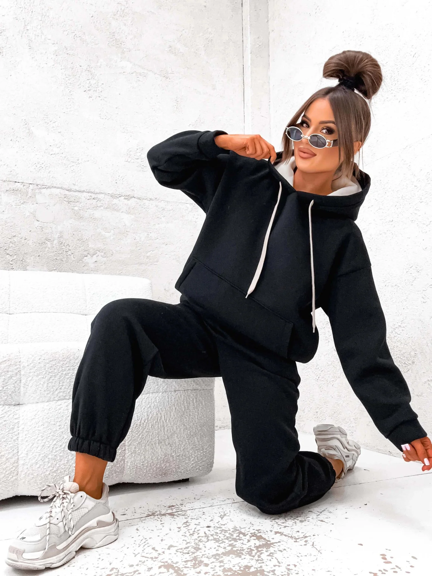 Tepláková souprava, která se skládá z volné mikiny a teplákových kalhot.