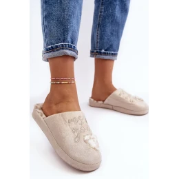 Lesklé dámské pantofle zdobené nápisem a srdíčkem. Nazouvací model se zakrytou špičkou. Nasazeno na tlusté podrážce. Vložka je zateplená kožíškem.Při výběru velikosti se prosím řiďte tabulkou velikostí.