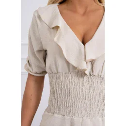 Představujeme vám módní šaty . Šaty do pasu s výstřihem do V a volánky. Šaty jsou vyrobeny z vysoce kvalitního materiálu. Ideální pro letní dny. Velikost je univerzální a vyhovuje dámám, které nosí velikost S, M nebo L.