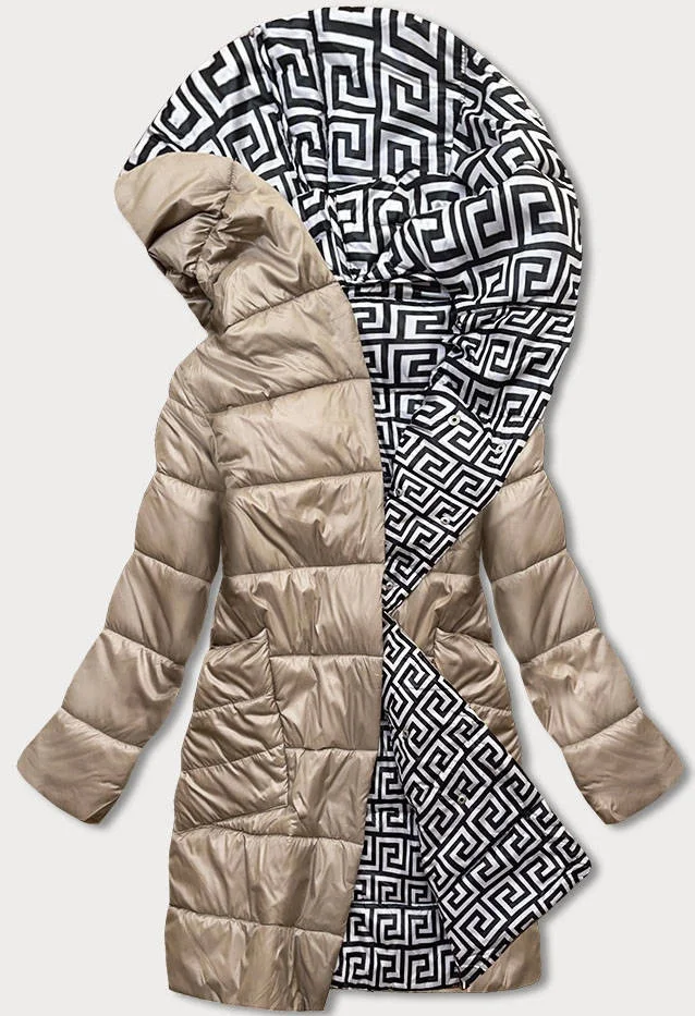 Béžovo-bílá přeložená obálková dámská bunda s kapucí (B8040-12026)