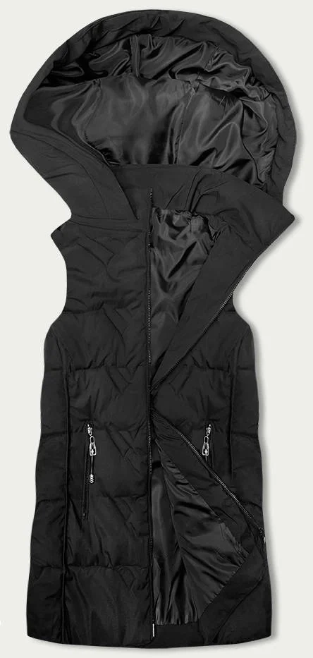 Vesta je zateplená syntetickou péřovou výplní, má dvě kapsy a zapíná se dvousměrným zipem. Model má kapuci, kterou je možné odepnout. Vesta má délku do poloviny stehen.