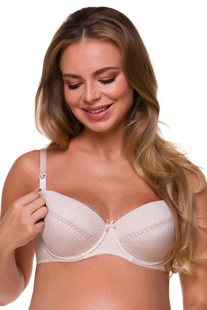 Výjimečný kousek spodního prádla vytvořený pro kojící ženy, které si cení pohodlí i sexy vzhledu. Podprsenka v teplé béžové barvě z mikrovlákna s drobnými puntíky. Podprsenka je lehce vyztužená s kosticí. Podprsenka je ideální pro kojení díky pohodlným odnímatelným klipům Clic-Clac umožňujícím odepnout a zapnout košíček jednou rukou a nakrmit tak dítě bez sundávání podprsenky. Košíčky jsou z vnitřní strany podšité bavlnou, která zvyšuje pohodlí. Ramínka jsou nastavitelná. Doporučujeme sadu kalhotek. Materiálové složení: 70 % polyamid, 20 % elastan, 10 % bavlna.