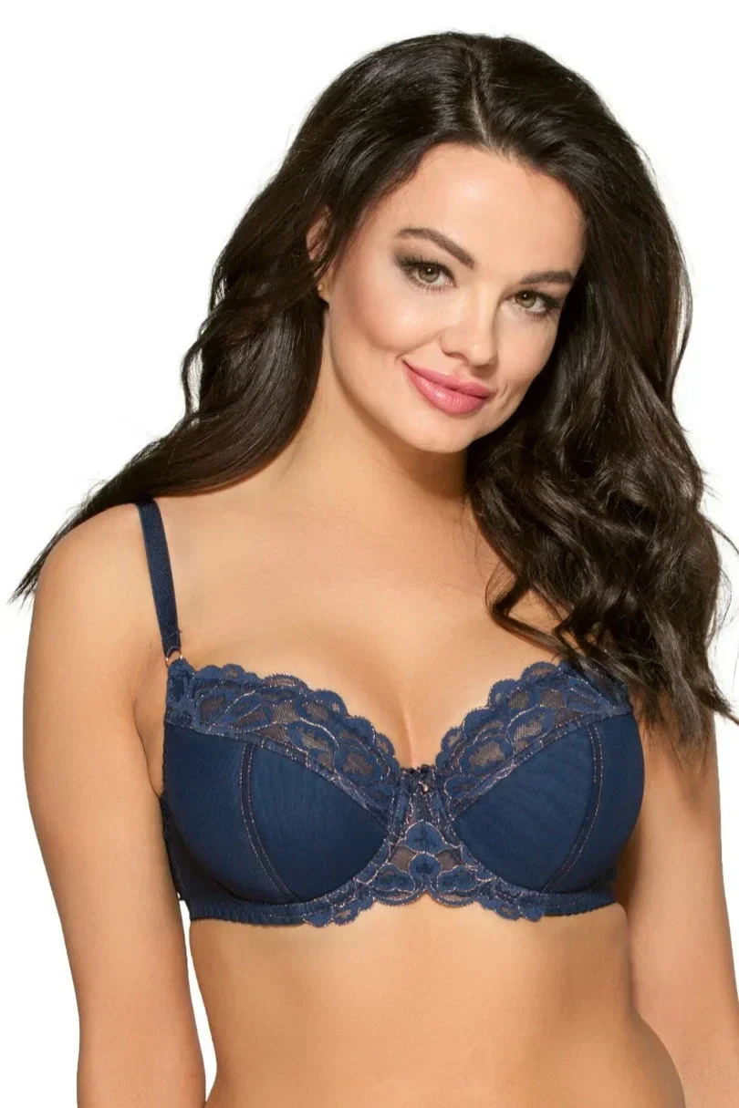 Spodní část košíčků je pro větší pohodlí při nošení vyztužená měkkou pěnou. Vrchní část košíčků tvoří mistrovská krajka v hluboké tmavě modré barvě. Ozdobou modelu jsou příze, kolečka a regulátory v barvě růžového zlata a jemná mašlička se slzičkou. Neporovnatelný střih a konstrukce K-1030, která je v případě této podprsenky použitá, je zárukou pohodlí a stabilizace poprsí. Model odlehčuje ramenům i zádům.