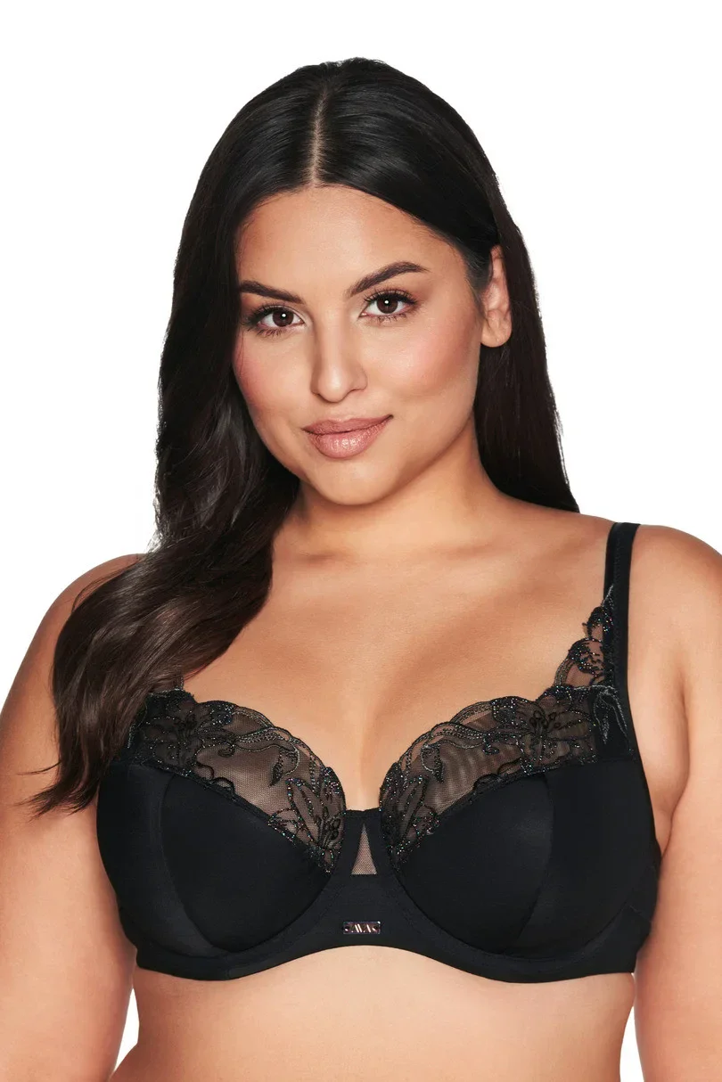 Półusztywniane miseczki od wewnątrz wyścielone zostały miękką pianką dla optymalnego kształtowania piersi, na zewnątrz zaś pokrywa je czarny tiul oraz niebanalny kwiatowy haft uzupełniony o energetyczne błyski. Bogato haftowane wstawki rozpięte między ramiączkiem a miseczką dodają modelowi lekkości i uroku. Bestsellerowa konstrukcja należycie zadba o zebranie i uniesienie biustu, a także o jego komfortowe podtrzymanie, a fikuśne figi świetnie uzupełnią całość. Zakochaj się w iskrzącej Tropei!