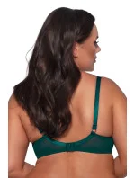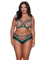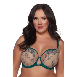 Podprsenka s béžovými vyztuženými košíčky zvedá a shromažďuje prsa k sobě, zatímco elastický obvodód a tylový průhledný můstek podprsenku vhodně stabilizují. Horní díl je pokrytý tylem vyšívaným lesklou nití ve složitém květinovém vzoru. Celý kousek půvabně obepíná kulaté poprsí, které ještě zvýrazňuje smaragdová lamów.