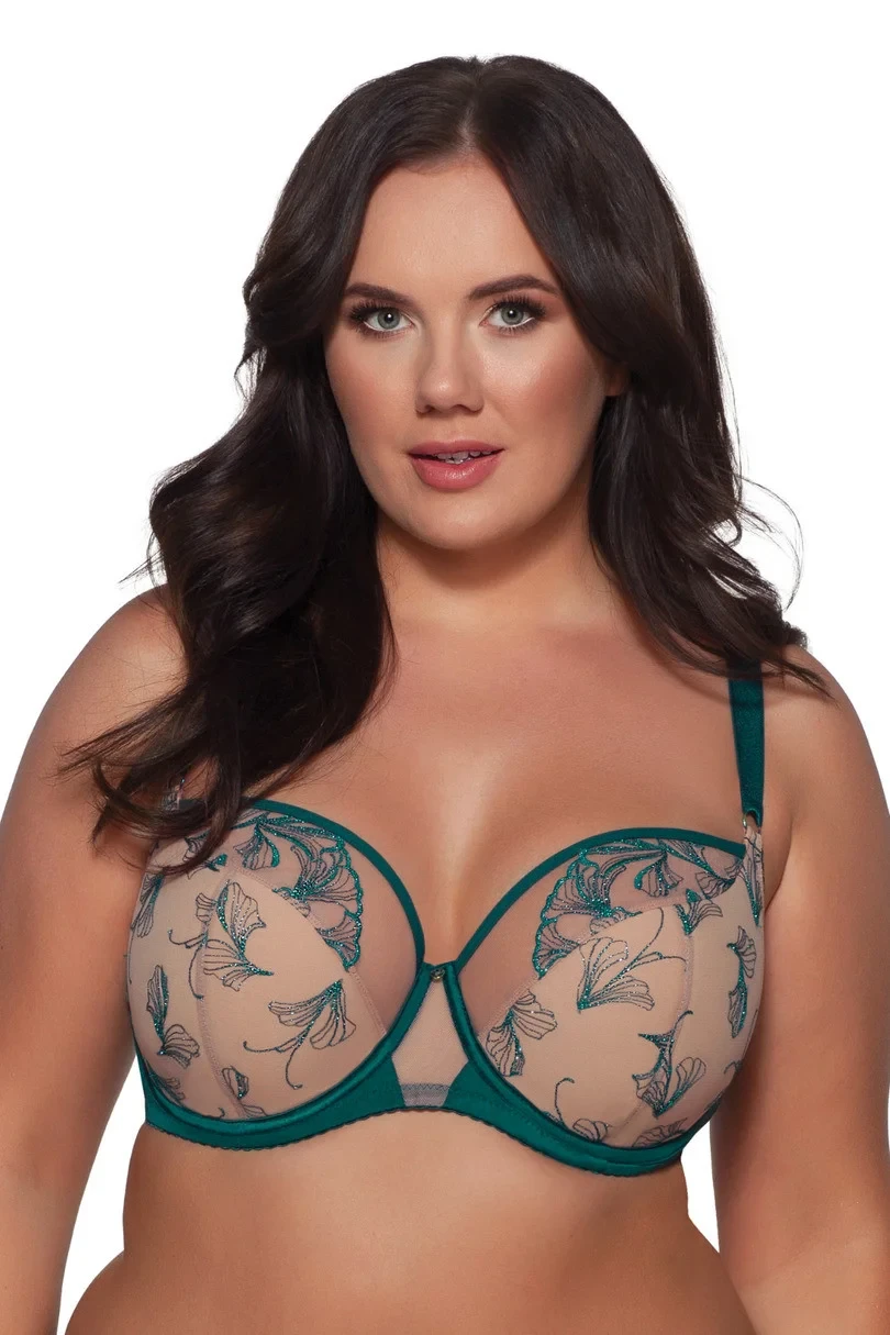Podprsenka s béžovými vyztuženými košíčky zvedá a shromažďuje prsa k sobě, zatímco elastický obvodód a tylový průhledný můstek podprsenku vhodně stabilizují. Horní díl je pokrytý tylem vyšívaným lesklou nití ve složitém květinovém vzoru. Celý kousek půvabně obepíná kulaté poprsí, které ještě zvýrazňuje smaragdová lamów.