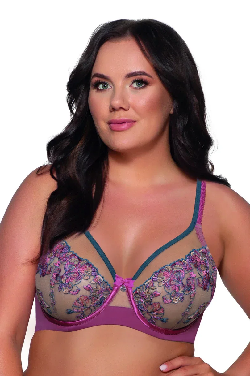 Průhledný tyl lemovaný lemováním v horní části košíčků a svůdná květinová výšivka vytvářejí harmonickou a ženskou kombinaci. Dvoubarevná ramínka, saténové tunýlky a sexy okénko na můstku dodávají celku šarm a energii.