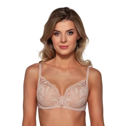 Biustonosz z usztywnionymi miseczkami typu push up uzupełnione miękkimi poduszkami w całości pokryte zostały misternie tkaną koronką. Delikatnie wychodzące poza obręb misek wykończenie oraz zdobny mostek pięknie podkreślają walory dekoltu. Ciepły beż i szlachetna czerń położone na cielistej piance prezentują się niezwykle gustownie, a delikatne ecru zachwyca wdzięcznym urokiem. Dla dopełnienia kompletu dobierz koniecznie majtki typu tanga lub klasyczne pełne figi.
