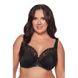 Košíčky jsou ve spodní části vyztužené měkkou pěnou, kteráóje z vnější strany překryta elastickým úpletem. Horní část košíčků je zase tvořena hustě tkanou květinovou krajkou, která plynule kopíruje tvar prsou a postupně se plazí nahoru po ramínku. Ozdobný hrudník a pružný obvodód jsou osvětleny kovovým štítkem s logem, který je umístěn nejen uprostřed mezi prsy, ale také na zadní straně u zapínání.