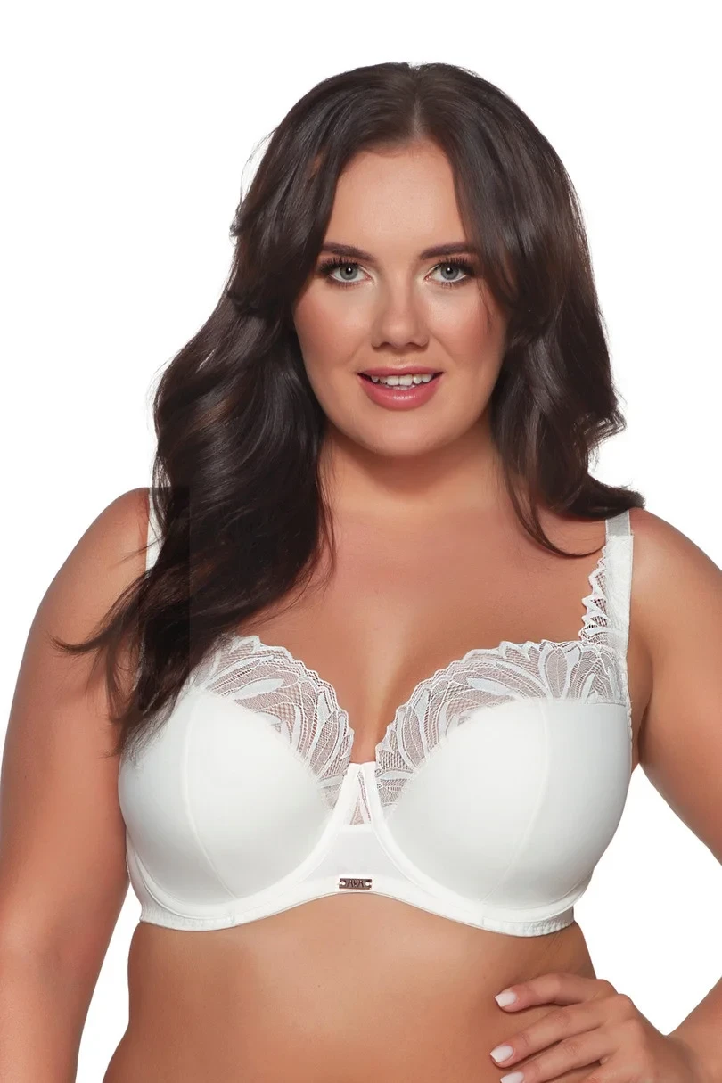 Košíčky jsou ve spodní části podšité měkkou pěnou, kterou z vnější strany pokrývá elastický úplet, zatímco horní část košíčků tvoří hustě tkaná květinová krajka, která plynule kopíruje tvar prsou a postupně se šplhá na ramínko. Ozdobný můstek a pružný obvod zvýrazňuje kovová destička s logem, umístěná nejen ve středovém bodě mezi prsy, ale také vzadu u zapínání.