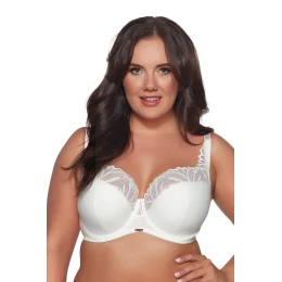 Miseczki wyścielone zostały w dolnych partiach miękką pianką, którą od zewnątrz pokryto elastyczną dzianiną. Górną część miseczek tworzy zaś gęsto tkana florystyczna koronka, która gładko przylega do kształtu piersi i stopniowo pnie się po ramiączku. Ozdobny mostek i sprężysty obwód rozświetlone zostały metalową blaszką z logotypem, umieszczoną nie tylko w centralnym punkcie między piersiami, ale także z tyłu przy zapięciu.