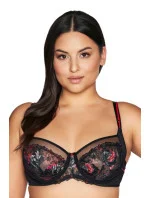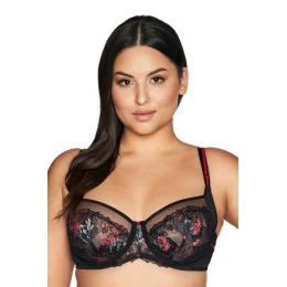 Miękkie miseczki ze stabilnym panelem bocznym fantastycznie zbierają piersi spod pach ku sobie, naturalnie je zaokrąglając. Subtelny kwiatowy haft oplata biust od spodu, pnąc się ku górze misek, które zostały wykończone czarnym tiulem i lamówką. Ozdobny bawet zwieńczony charakterną kokardką w centralnym punkcie nadaje biustonoszowi lekkości, a czerwone paseczki z błyszczącym kółkiem ulokowane na ramiączkach przyciągają wzrok.