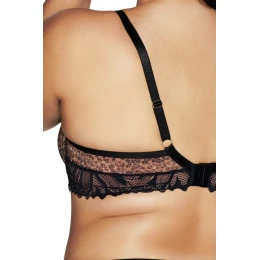 Miseczki, wykonane z półusztywnianej konstrukcji K-1030, tworzą harmonijną kompozycję z cętkowaną dzianiną, bogato tkana czarna koronka i delikatny, cielisty tiul. Te elementy perfekcyjnie kształtują biust, nadając mu atrakcyjny wygląd i podkreślając kobiece krągłości. Dwudzielny obwód nie tylko utrzymuje biust w odpowiednim miejscu, ale także dodaje mu subtelnego uroku.