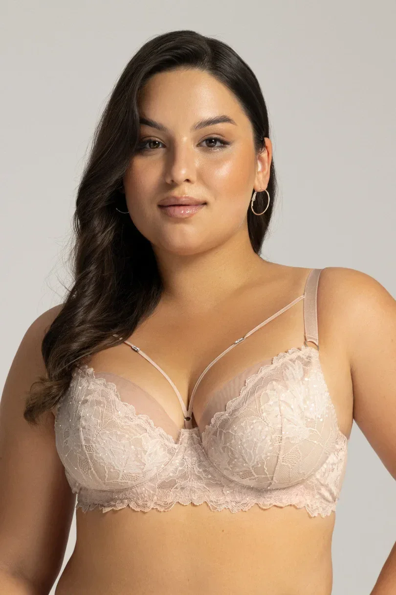 AV 2154 Fiesta Semi Soft – zachwycający półusztywniany biustonosz, który łączy w sobie elegancję i komfort. Miseczki, wyścielone od dołu miękką pianką, zapewniają stabilne podtrzymanie, a ich górna część z cielistego tiulu stapia się ze skórą, tworząc efekt delikatnej przezroczystości. Zarówno miseczki, jak i bawet pokryte są bladoróżową koronką o srebrzystym połysku, która wdzięcznie podkreśla urok kobiecego ciała. Odpinane paseczki z cyrkoniami dodają biustonoszowi odrobiny blasku i pozwalają na indywidualne dopasowanie stylu. Koronkowy bawet subtelnie odciąża całość, nadając modelowi lekkości i wdzięku. Viva la Fiesta!