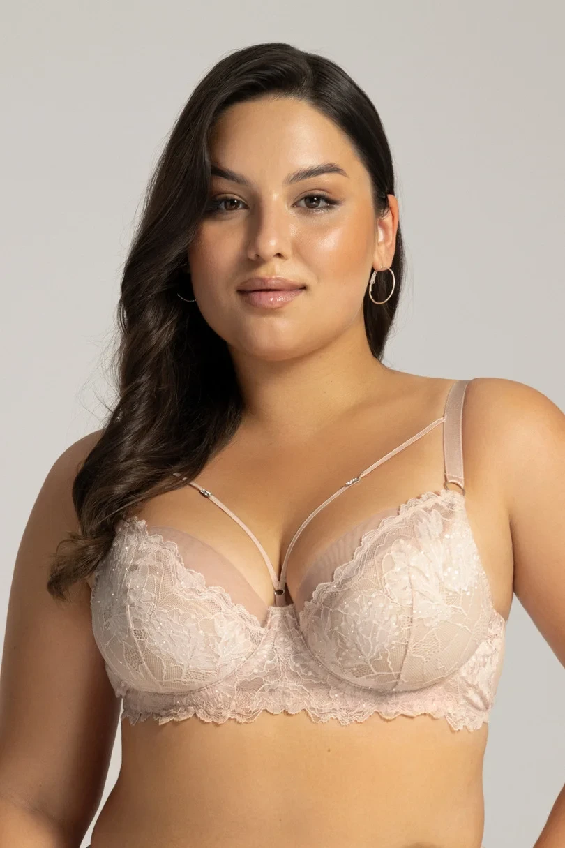 AV 2154 Fiesta Semi Soft – zachwycający półusztywniany biustonosz, który łączy w sobie elegancję i komfort. Miseczki, wyścielone od dołu miękką pianką, zapewniają stabilne podtrzymanie, a ich górna część z cielistego tiulu stapia się ze skórą, tworząc efekt delikatnej przezroczystości. Zarówno miseczki, jak i bawet pokryte są bladoróżową koronką o srebrzystym połysku, która wdzięcznie podkreśla urok kobiecego ciała. Odpinane paseczki z cyrkoniami dodają biustonoszowi odrobiny blasku i pozwalają na indywidualne dopasowanie stylu. Koronkowy bawet subtelnie odciąża całość, nadając modelowi lekkości i wdzięku. Viva la Fiesta!