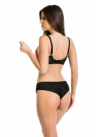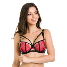 Košíčky jsou vyrobené ze síťoviny v barvě mokka, na kterou je našitá červená krajka. Černé lemovky překrývají svislé švy. Model dokonale zvýrazňuje poprsí a ozdobné pásky pěkně zdobí dekolt.