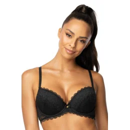 Push-up podprsenka, která je ušitá z černé krajky a jemné síťoviny. Má kostice, odnímatelné vložky, nastavitelná a neodnímatelná ramínka. Podprsenka je zdobená šperkem a mašlí.