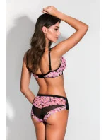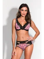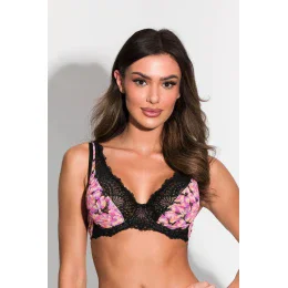 Ten miękki biustonosz o kroju braletki jest idealnym wyborem dla kobiet posiadających mniejsze i średnie biusty, zapewniając zarówno komfort, jak i styl. Dekolt biustonosza udekorowany jest czarną koronką, natomiast miseczki ozdobione są kwiatowym wzorem, dodając mu subtelności i elegancji.