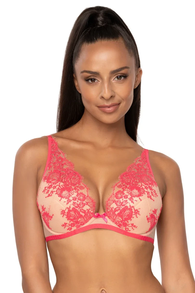 Push-up podprsenka, která je ušitá z elegantní krajky a jemné síťoviny. Má kostice, odnímatelné vložky, nastavitelná a neodnímatelná ramínka. Podprsenka je zdobená bižuterním prvkem, mašlí a ramínky prodlouženými zdobeným tylem.