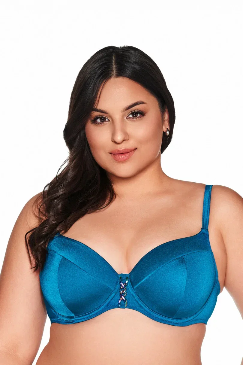 Objevte šik a eleganci s naší plavkovou podprsenkou v sytě azurové barvě, která evokuje krásu modré laguny. Tato vysoce stylová podprsenka je navržena tak, aby poskytovala dokonalou oporu a skvělý vzhled, s vyztuženými košíčky, které přesně shrnují prsa dovnitř a vytvářejí úžasný dekolt, který přitahuje pohledy.