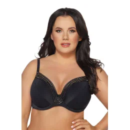 Klasická černá plavková podprsenka v novém luxusním vzhledu. Sytě černá barva SK 209 krásně ladí se zlatým třpytem stuhy korunující košíčky a můstek. Měkké košíčky shrnují prsa k sobě, zatímco třpytivý detail výstřihu zvýrazňuje jejich přitažlivé křivky. Nezapomeňte soupravu sladit s klasickými kalhotkami SF 209/12 s lurexovou stuhou nebo se skrovnou podprsenkou SF 209/13/B s lesklou vsadkou na bocích.