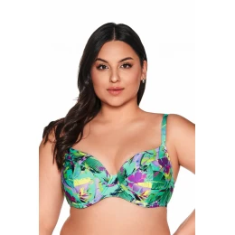 Biustonosz kąpielowy z usztywnionymi miseczkami, którego kolory-połączenie zieleni z neonem i fioletem, przywołuje atmosferę gorącego lata. Elegancja w połączeniu z motywem natury idealnie sprawdzi się podczas tropikalnej wakacyjnej przygody. Dodatkowo, blaszka i zapięcie dodają szyku, wszystko to w oryginalnym połysku holograficznym. Miseczki wykonane z elastycznego materiału i usztywnienie piankowe zapewniają idealne dopasowanie do piersi, eksponując Twoje atuty, dzięki czemu poczujesz się wyjątkowo. Ramiączka zapewniają doskonałe podparcie biustu, zapewniając jednocześnie komfort noszenia