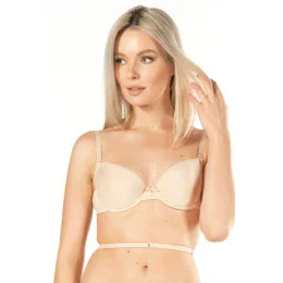 Push-up podprsenka, hladké košíčky z mikrovlákna. Odnímatelná a nastavitelná ramínka, zkřížená záda zapínaná na břiše.