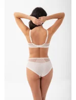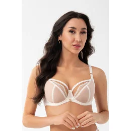 Biustonosz miękki przeznaczony dla kobiet ze średnim dużym i bardzo dużym biustem. Zapewnia efekt mocnego uniesienia i zebrania biustu do środka, 3-częściowe miski wykonane z tiulu stabilnego oraz koronki elastycznej o wyglądzie kabaretki. Górna krawędź miski wykończona szeroką taśmą. Dla zwiększenia komfortu użytkowania górna krawędź pasa obwodu wykończona miękkimi lamówkami. Tył z kryjącej lycry połączonej z koronką elastyczną i tiulem. Tył z kryjącej lycry połączonej z koronką elastyczną i tiulem. Krzyżujący się mostek, wyprofilowany tak, aby nie powodować ucisków. Fiszbiny boczne zapobiegające zwijaniu się materiału. W zależności od rozmiaru dwu lub trzyrzędowa haftka z trójstopniową regulacją obwodu. Nieodpinane, regulowane ramiączka w trzech szerokościach. Metalowe elementy w kolorze jasnego złota (nie zawierają niklu