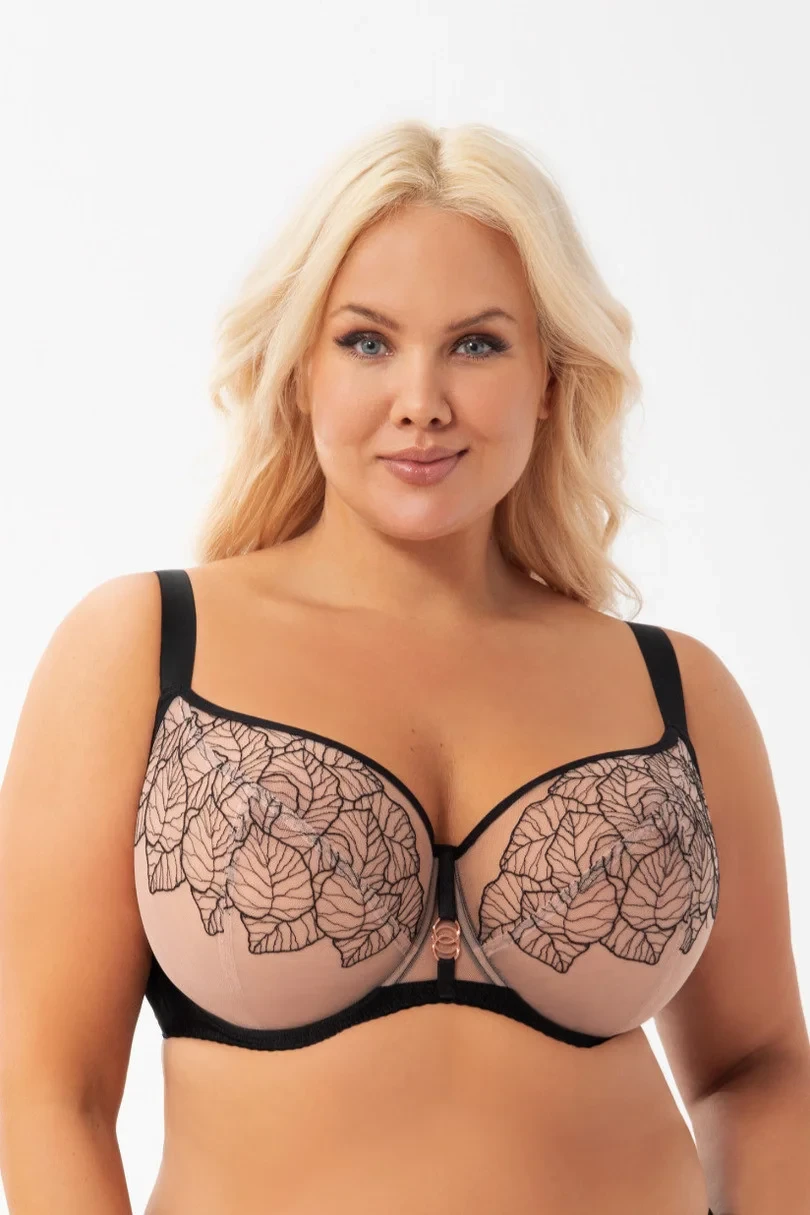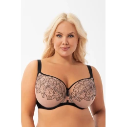 Biustonosz miękki przeznaczony dla kobiet ze średnim, dużym oraz bardzo dużym biustem. Zapewnia efekt bardzo mocnego uniesienia i zebrania biustu do środka, 3-częściowe miski wykonane z haftu podszytego tiulem stabilnym. Dla zwiększenia komfortu użytkowania górna krawędź pasa obwodu wykończona miękkimi lamówkami. Górna krawędź miski przechodzi płynnie do ramiączka powodując lepsze podtrzymanie biustu. Na baskince element ozdobny w kolorze różowego złota. Tył z kryjącej lycry o wysokiej gramaturze i sprężystości dla zwiększenia komfortu. Fiszbiny boczne zapobiegające zwijaniu się materiału. W zależności od rozmiaru dwu lub trzyrzędowa haftka z trójstopniową regulacją obwodu. Nieodpinane, regulowane ramiączka w trzech szerokościach. Metale w kolorze różowego złota (nie zawierają niklu)