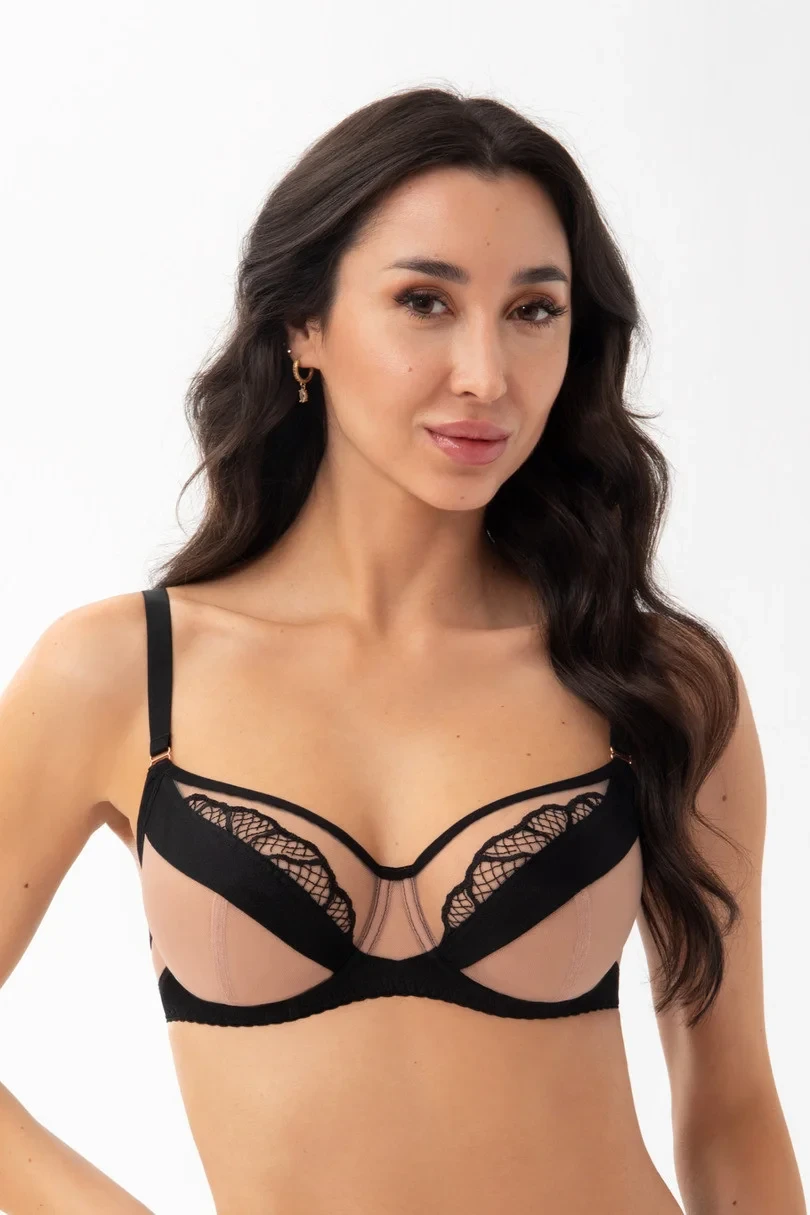Biustonosz miękki przeznaczony dla kobiet ze średnim, dużym oraz bardzo dużym biustem. Zapewnia efekt bardzo mocnego uniesienia i zebrania biustu do środka, 4-częściowe miski wykonane z tiulu stabilnego, kryjącej dzianiny typu simplex oraz haftu. Kryjąca ukośna wstawka zasłania sutki i optycznie wysmukla sylwetkę. Górna krawędź miski przechodzi płynnie do ramiączka powodując lepsze podtrzymanie biustu. Dla zwiększenia komfortu użytkowania biustonosz na plecach wykończony szeroką taśmą elastyczną, a pachy obszyte miękkimi lamówkami. Fiszbiny boczne zapobiegające zwijaniu się materiału, w zależności od rozmiaru dwu lub trzyrzędowa haftka z trójstopniową regulacją obwodu, nieodpinane, regulowane ramiączka w trzech szerokościach. Metalowe elementy w kolorze różowego złota (nie zawierają niklu).