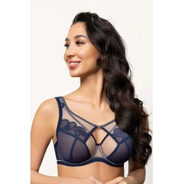 Wyjątkowy miękki biustonosz dla kobiet ze średnim, dużym i bardzo dużym biustem. Miseczki wykonane są ze stabilnego tiulu, górna część miseczki pokryta dodatkowym elementem wierzchnim z siateczki i koronki, dodatkowa warstwa na górnej misce – uniesienie i zebranie biustu do środka sylwetki. Pas i miseczki wykończone miękkimi lamówkami – dla zwiększenia komfortu użytkowania, szerokie ramiączka z pianki, których zadaniem jest odciążyć ramiona i kręgosłup. Zapięcie: haftka, w zależności od rozmiaru, dwu- lub trzyrzędowa z 3-stopniowymi regulacjami obwodu.