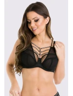Měkká podprsenka, košíčky ze dvou vrstev černého tylu, bez bočních kostic, výstřih zdobí stříbrné proužky.