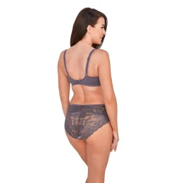 Poloměkká podprsenka s kosticemi, spodní část košíčků z pěny pokrytá efektní krajkou, horní část košíčků z tylu zakončená lamówlem.