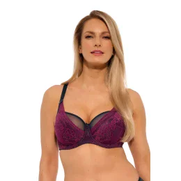 Podprsenka, vyztužená, horní část košíčků z jemného tylu v barvě tmavě modré, zakončená páskem. Spodní část košíčků je vytažena tak, aby zakryla celou bradavku, na vnější straně je na ramínku vytažena tmavě fuchsiová krajka.