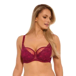 Biustonosz GAIA na duży biust to doskonałe połączenie elegancji i niezawodnego wsparcia, zaprojektowany z myślą o kobietach poszukujących wygody i pięknego wyglądu. Półusztywniane miseczki, wykonane z mocnej, transparentnej siateczki i ozdobione koronką w głębokim kolorze malinowym, nadają mu subtelnej zmysłowości. Górna listwa wykończona delikatną taśmą dodaje biustonoszowi klasy i lekkości. Solidna konstrukcja z bocznymi fiszbinami wspiera i stabilizuje biust, zapewniając komfort i pewność siebie przez cały dzień. Biustonosz GAIA to synonim stylu, wygody i perfekcyjnego dopasowania – spełni oczekiwania kobiet ceniących jakość i wyjątkowy design.