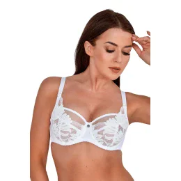 Měkká podprsenka s kosticemi. Košíčky ušité z jemné krajky podšité nepružným tylem zakončené stuhou. Podprsenka má boční velrybí kostice, zadní část podprsenky je vyrobena ze stabilní hladké tkaniny, která dokonale drží obvod.