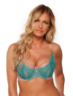 Měkká podprsenka, béžové síťované košíčky pokryté tyrkysovou krajkou.