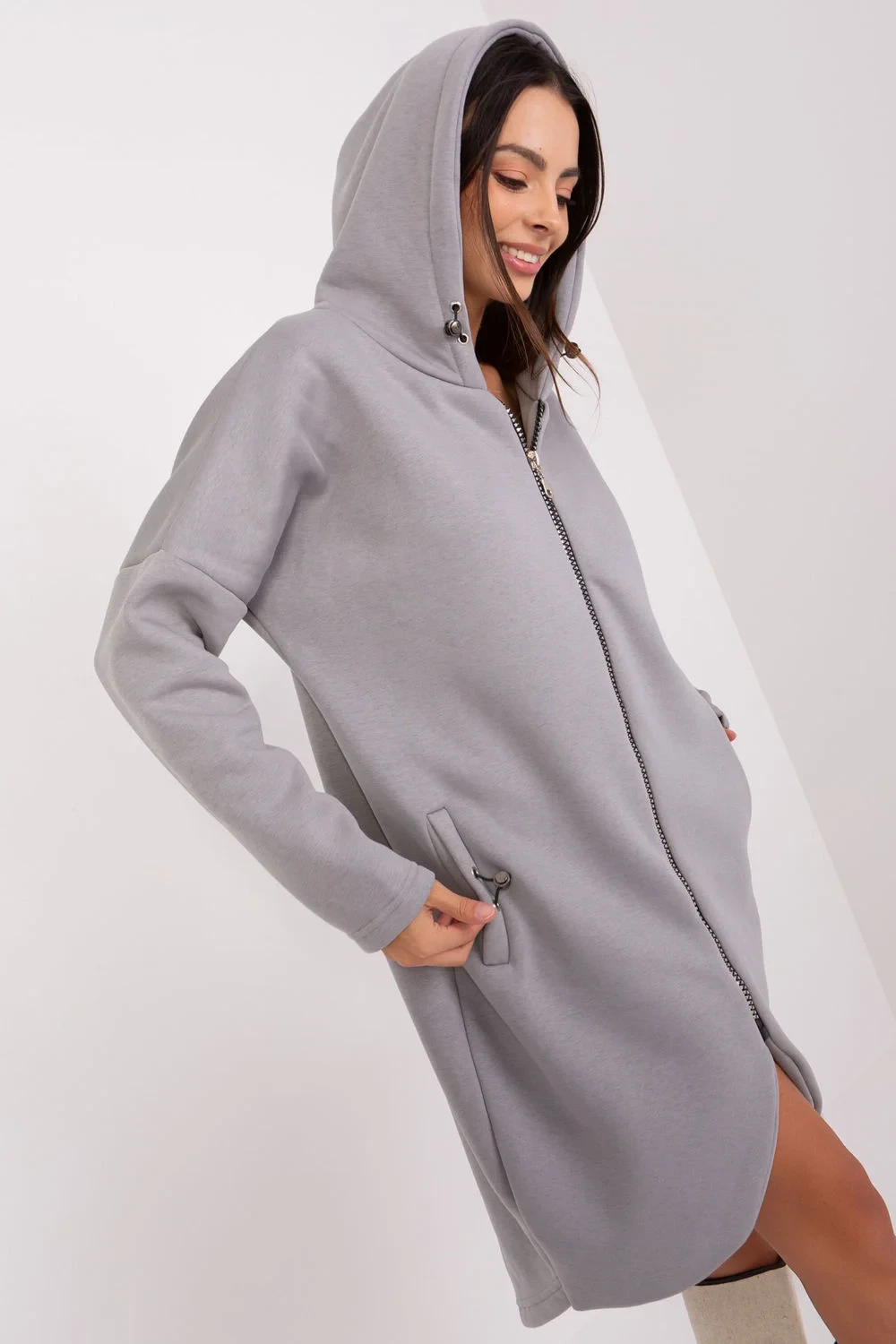Mikina s prodlouženým střihem a zapínáním na zip. Mikina s dlouhými rukávy a kapucí. Kapsy na bocích.
