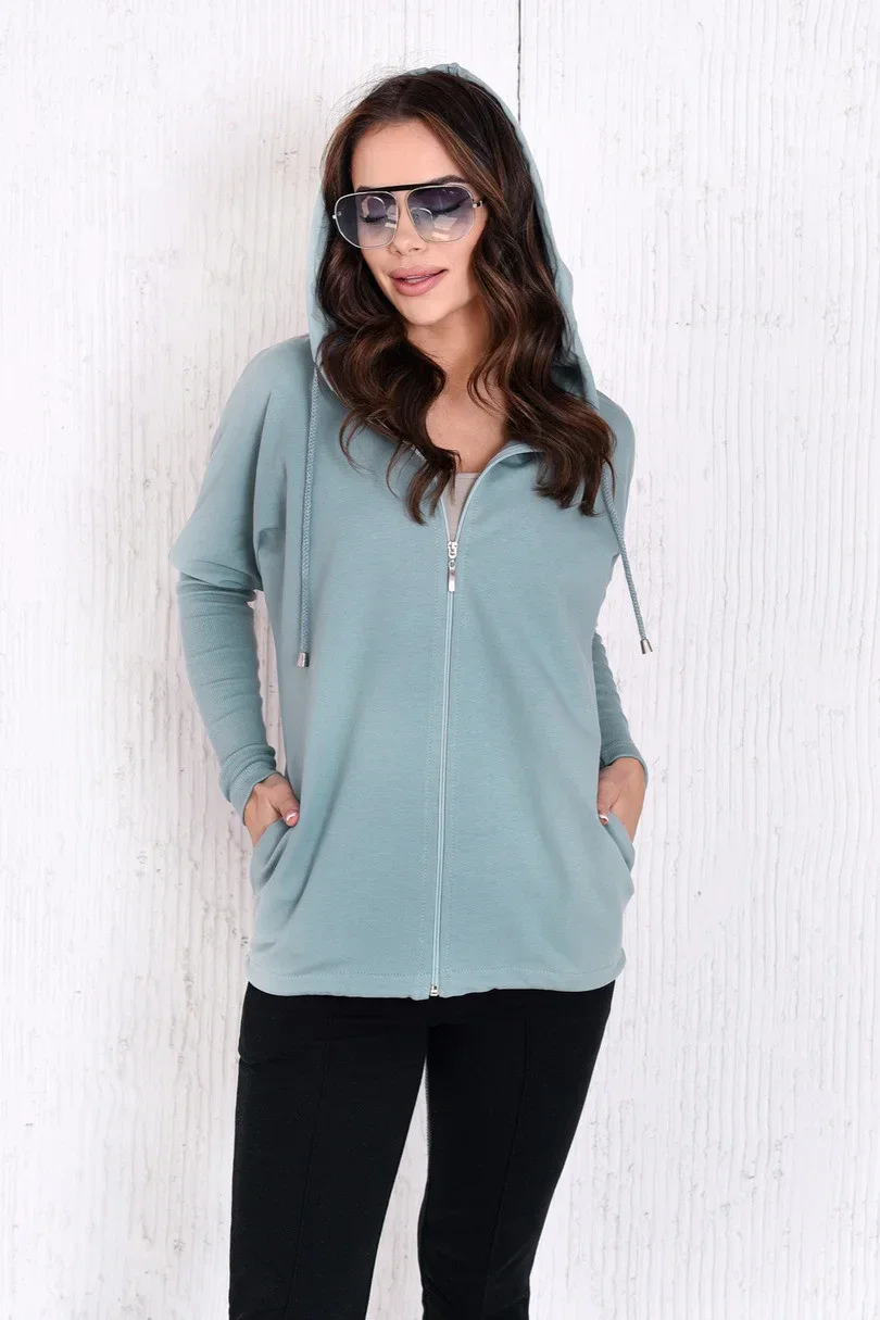 Dámská rozepínací mikina s kapucí. žebrované rukávy, zadní díl mikiny prodloužený s rozparkem a šňůrkou na stažení. složení: 95 % bavlna, 5 % elastan