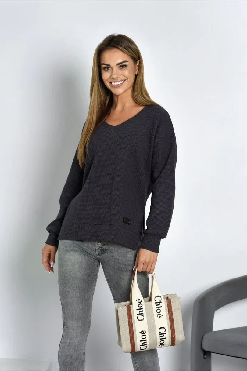 Dámská mikina volného střihu s výstřihem do V je stylovým a pohodlným doplňkem každodenní stylizace. Její jedinečná vaflová struktura jí dodává charakter, zatímco boční rozparky jí dodávají lehkost a volnost pohybu. Spodní část mikiny zdobí elegantní černá nášivka s decentním zlatým nápisem "OFF PINK", která podtrhuje moderní design. Je vyrobena z bavlny s příměsí elastanu a poskytuje pohodlí po celý den. Je ideální volbou pro ženy, které ocení pohodlí a módní vzhled v jednom.